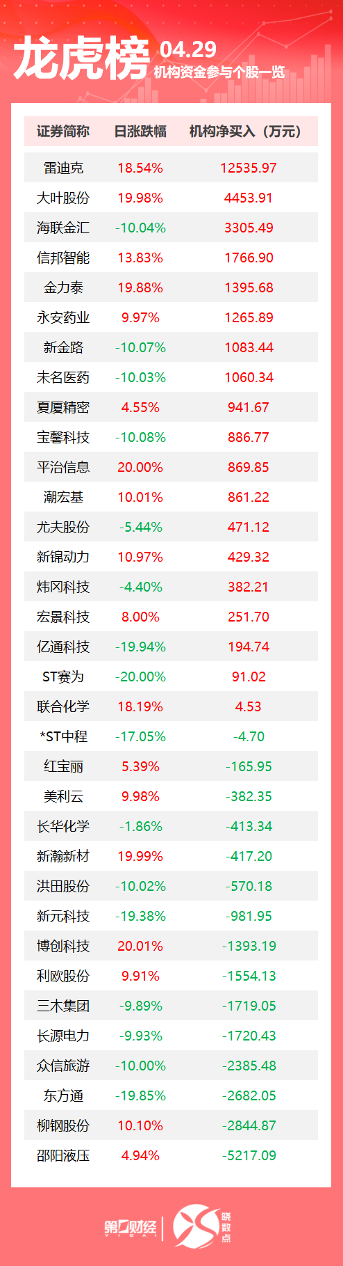 当天机构净买入前三的股票分别是雷迪克、大叶股份、海联金汇,净买入金额分别是1.25亿元、4454万元、3305万元。